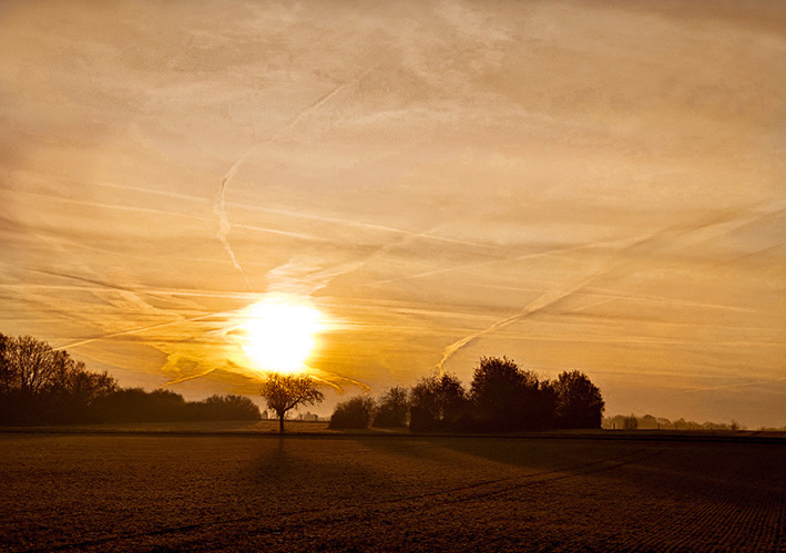 Über den kahlen Feldern und über dem Dunst, in dem die Stadt liegt, geht die Sonne auf. So kann Winter auch sein. Wir hatten tatsächlich schon 4 Frosttage im November und gerade kommt eine neue Frostwarnung herein. Seit wann fällt Frost eigentlich unter die warnwürdigen Zustände?