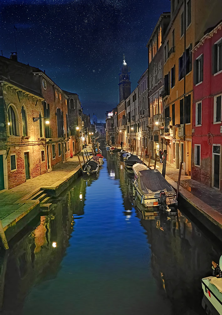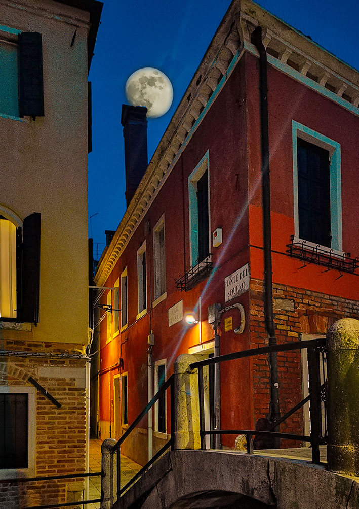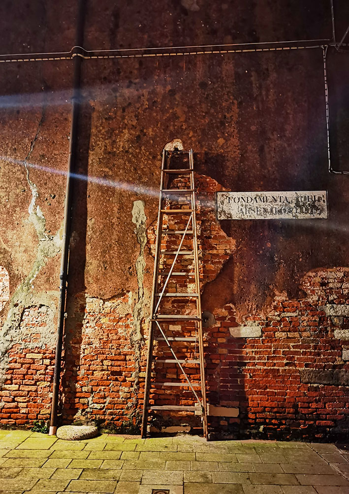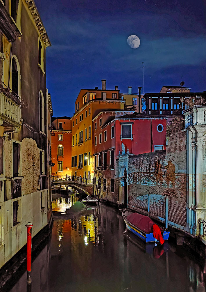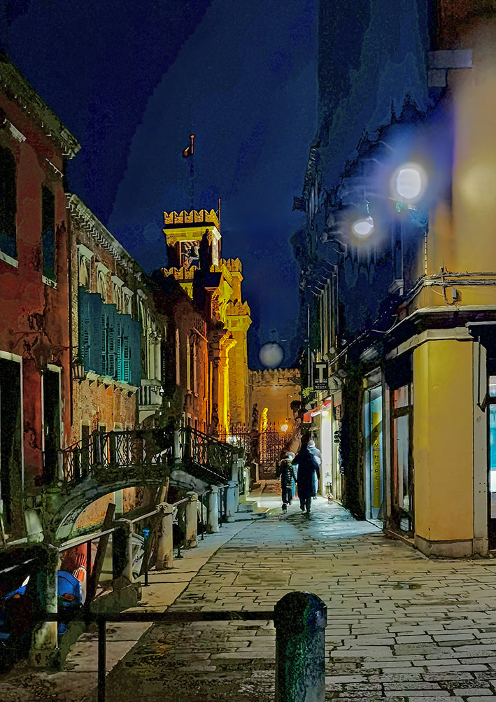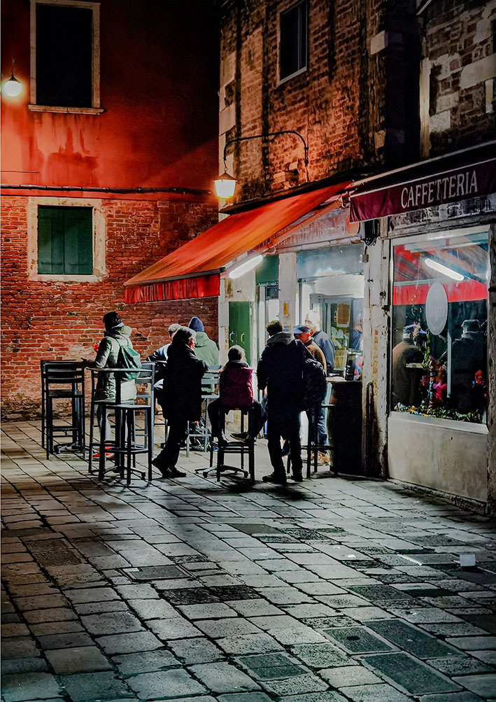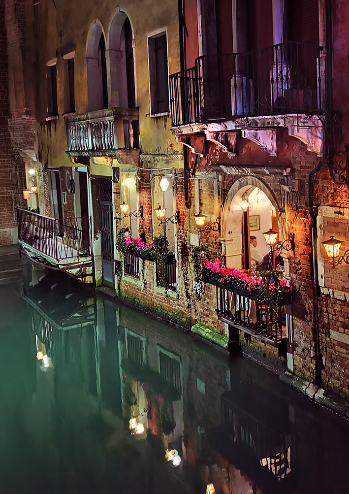 Die schönsten Spaziergänge fingen bei beginnender Dunkelheit an. Jetzt bekam die Kamera etwas zu tun. Die Stadt schien dann leer von Touristen. Nur noch zielstrebig heimlaufende Bewohner, allein die Vaporettos sind voll. Zwei Stunden später sitzen alle in den Restaurants, Bars, Osterias und Trattorias beim Essen. Es sind nur fünf Grad, was niemanden daran hindert, im Freien Espresso oder Wein zu trinken und zu schwatzen. Auch für uns noch einen Teller Pasta und dann über möglichst viele neue Brücken erschöpft wieder heim in unseren Palast.