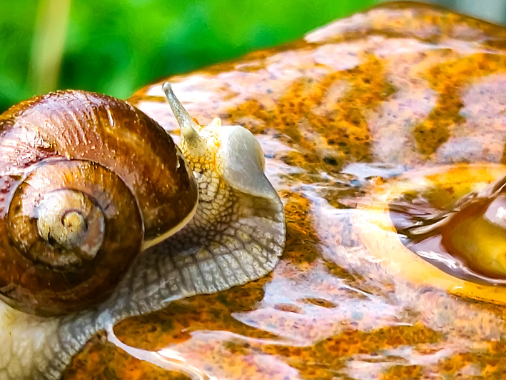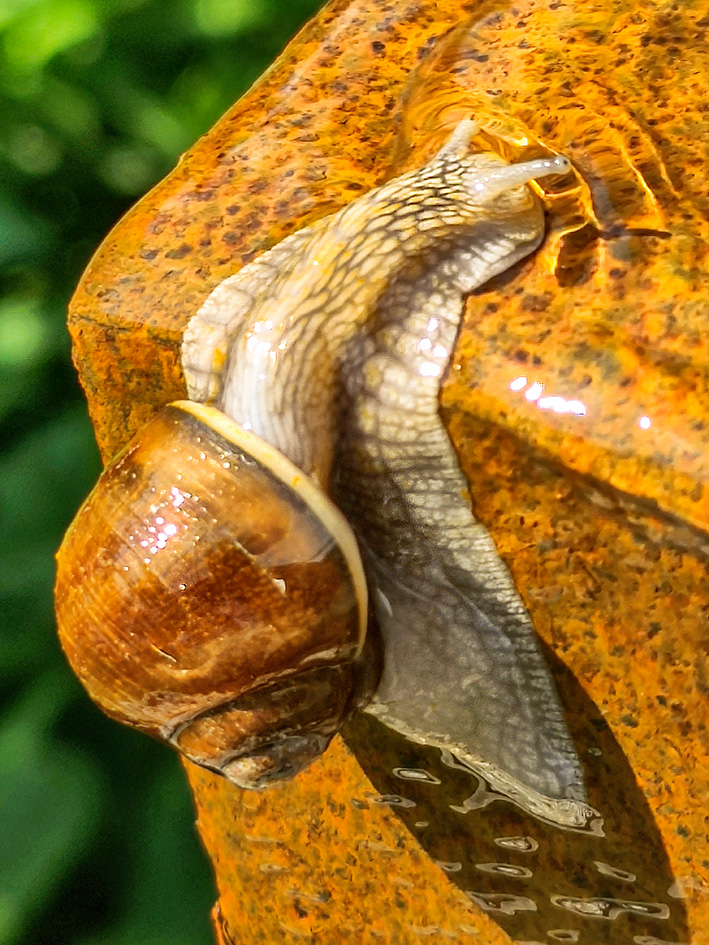 Bei der Art scheint es sich um eine Weinbergschnecke zu handeln. Dass sie baden gehen, war mir nicht bekannt. Aber Tante Google erzählt, dass Schnecken durchaus und gerne baden. Man sollte sie nur nicht dazu zwingen :-)) ??