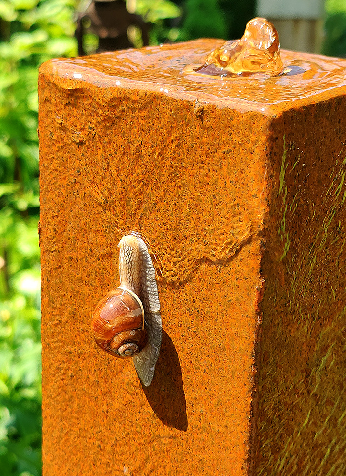 Aufgeben tut sie nicht. Oben angekommen, denke ich kurz über Selbstmordabsichten nach, bewegt sie sich doch stetig auf das Wasseraustrittsloch hin. Aber denkste. Sich aufrichtend checkt sie die Lage – und dreht ab. Eine weise Schnecke.