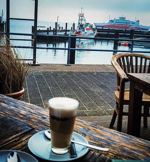 Am nächsten Morgen ist es grau und dunstig. Wir laufen im Norden auf dem Weg nach List am Strand den frischen Flutsaum ab. Dann lassen wir die 800 Teilnehmer des Sylt Marathons an uns vorbei ziehen, bevor wir in List am Hafen auf der Wattseite einen Latte Macchiato bestellen und dem Ablegen der Sylt Fähre nach Dänemark zusehen.