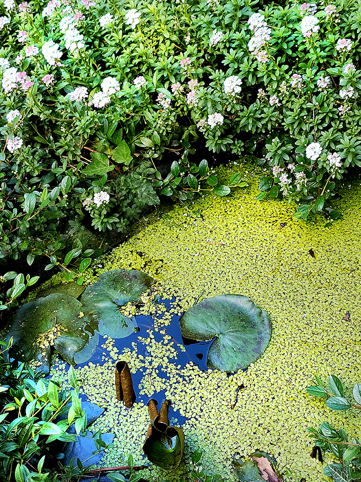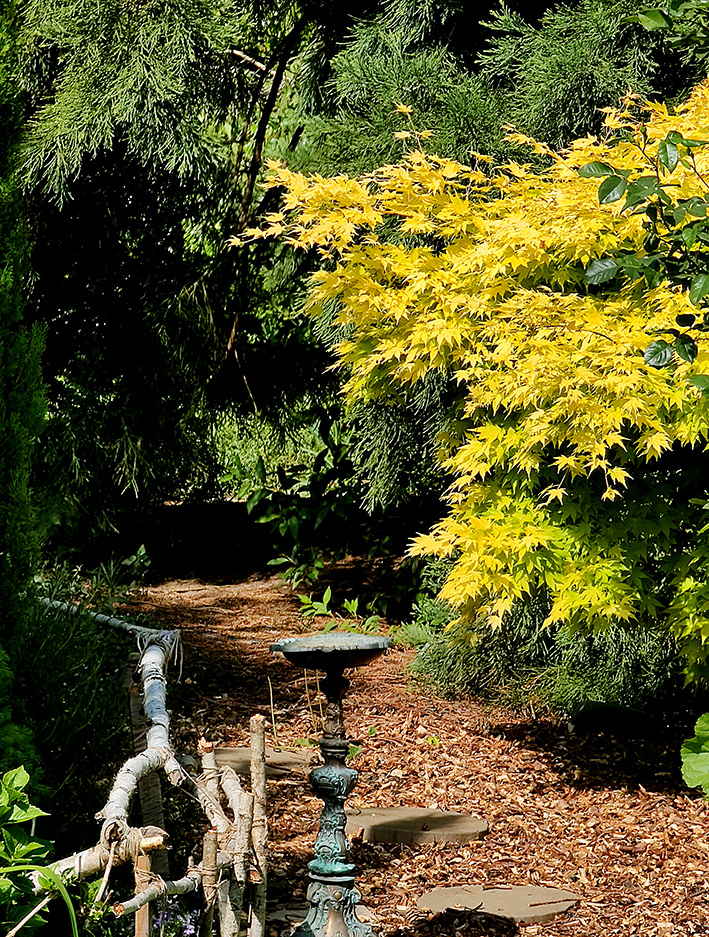 Dieser Weg führt am gelb lodernden Fächerahorn vorbei, unter dem großen Lebensbaum hindurch zum Miniteich, in dem sich die neuen Seerosenblätter gerade entrollen.