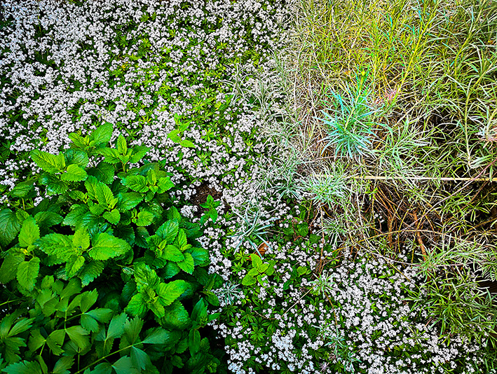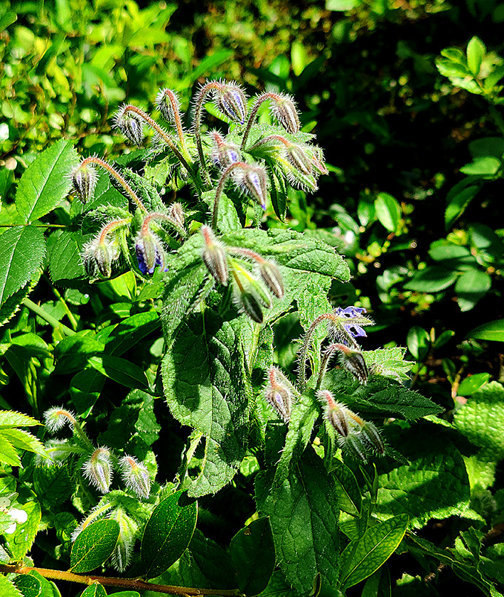 Unser Garten wird immer wilder. Überall haben wir Wildblumen ausgesät. Besonders erfolgreich hat sich der Borretsch etabliert und macht sich von ganz alleine breit. Er blüht wunderbar lang. Schlüsselblumen sprießen zwischen den Kieseln auf dem Weg hervor. Wir haben es mit wilden Stiefmütterchen versucht. Mal sehen, was nächstes Jahr daraus geworden ist. Der alte Kräutergarten ist verwildert. Er lag zu schattig. Heute kann ich Waldmeisterbowle für alle machen. Minze und Liebstöckel haben übernommen und das Currykraut schlägt sich wacker. Das tränende Herz wuchert überall. Die Clematis wächst einen alten gekappten Baumstamm hoch.