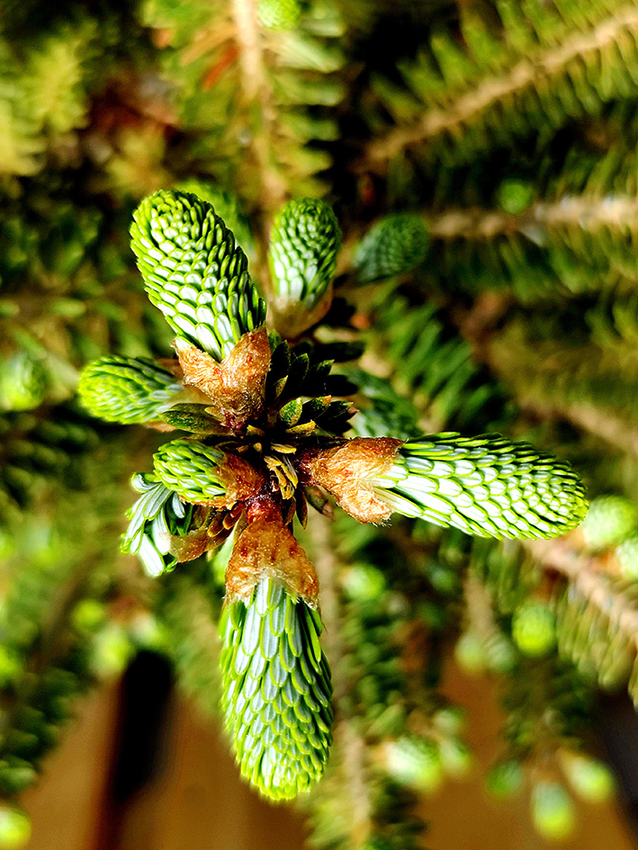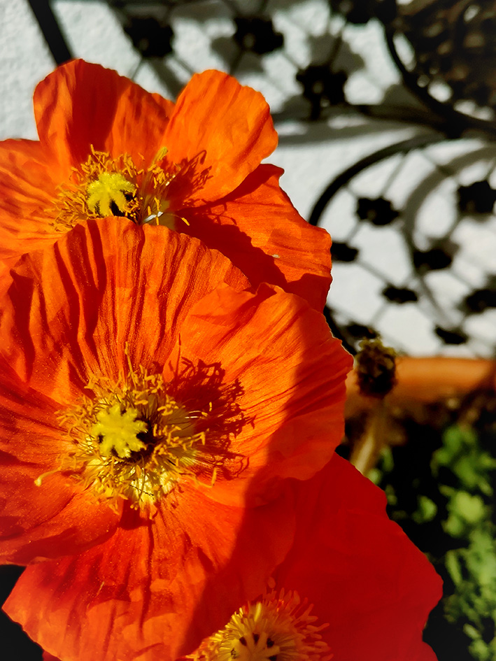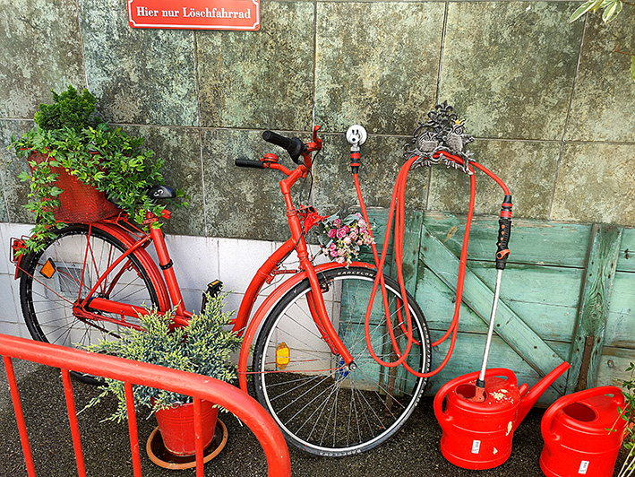 Im Vorgarten sprießen die hellgrünen Triebe der Nadelhölzer. Einige davon zieren unsere „Löschfahrrad-Ecke“, die der Wasserspender für den Vorgarten ist. Den Mohn haben wir auf einen alten Bistrometallstuhl neben die Haustür gestellt.