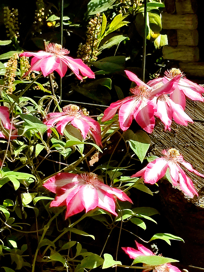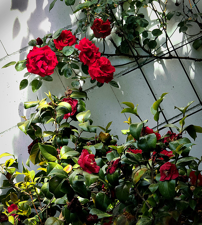 Die ersten Rosen haben sich geöffnet. Hunderte mehr werden jetzt schnell folgen. An der Mauer blühen Kamelie und Rankrosen um die Wette.