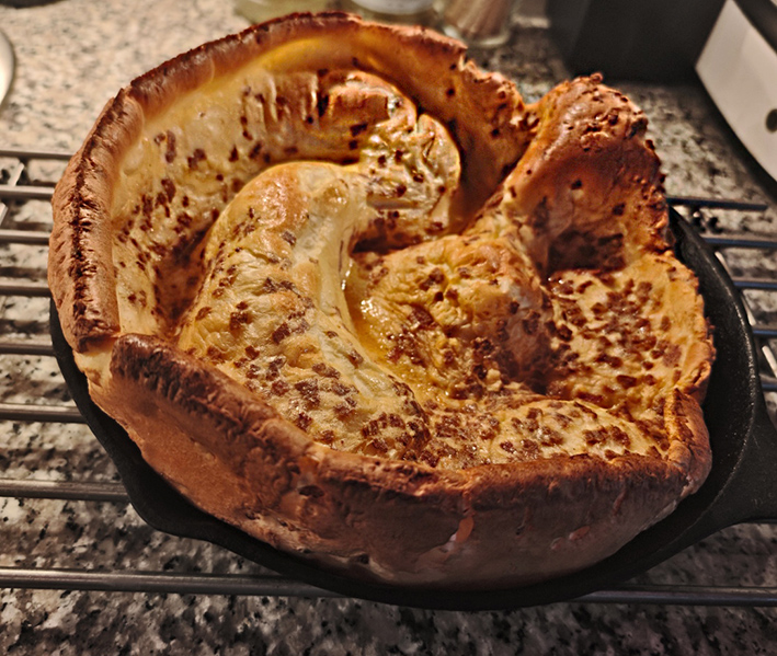 Im richtigen Verhältnis werden Mehl, Eier, Milch, eine wenig Salz, Zucker und Zitrone verrührt und in eine mit Butter ausgestrichene sehr, sehr heiße Eisenpfanne gegeben. Dann fix ein Viertelstündchen in den heißen Ofen geben und staunen. Der Pfannkuchen bläht sich mächtig auf, protzt mit Luftblasen und knusprigen Rändern und einem saftigen Mittelteil.