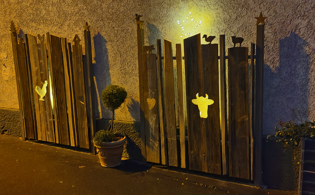 Diesen speziell für uns gestalteten Zaun haben wir neulich aus dem Allgäu geholt. Na ja, zumindest einige Teile davon. Konzept, Aufbau und Beleuchtung: mein Lieblingsmensch, der – fast – alles kann. Er, der Zaun, fungiert hier, wie ihr seht, nicht als Zaun, sondern als Deko entlang unserer sehr langen Einfahrt an der grenzgebauten Mauer des Nachbarn, mit der wir ja sonst nicht machen können.