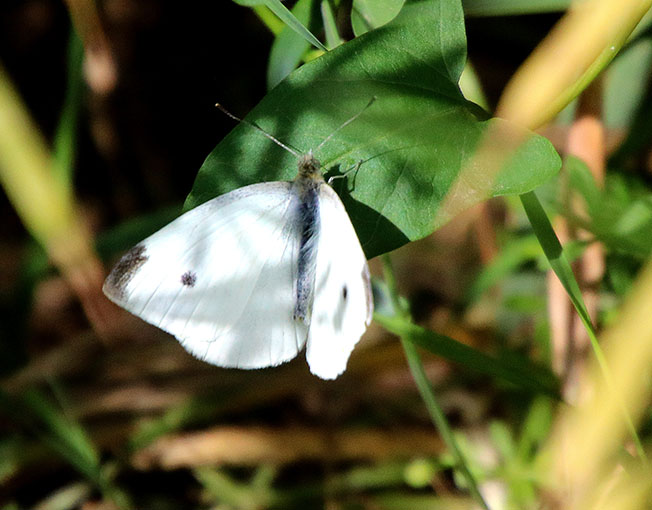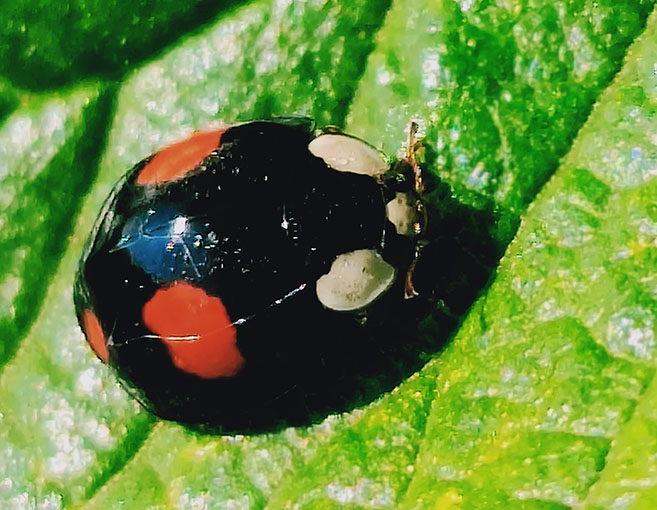 In der warmen Sonne fliegen Wild- und Honigbienen vor allem um den Reiherschnabel herum. Und ich finde einen noch etwas starren Rapsweißling und einen lackschwarzen Zweipunktmarienkäfer.
