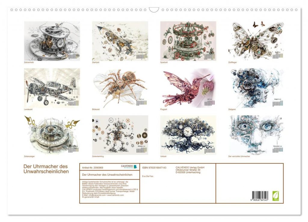 In diesem Jahr macht sich „Der Uhrmacher des Unwahrscheinlichen“ über die Uhrwerke her. Dieses Jahr einer meiner Lieblinge. Deshalb ausnahmsweise dazu mal der Werbetext: Tauchen Sie ein in die wundersame Welt des Uhrmachers des Unwahrscheinlichen – einem Exzentriker, der keine Uhren baut, sondern lieber kunstvolle Dinge und Wesen erschafft aus Zahnrädern, Spiralfedern, Platinen, Zeigern und Rotoren. Dieser kunstvolle Kalender zeigt zwölf seiner seltsam-schönen Kreationen und tickenden Ideen in detailverliebter Fine-Line-Ästhetik, im Stil zart colorierter technischer Zeichnungen und Explosionszeichnungen. Ein visuelles Kunstwerk für Uhrenfreunde, Liebhaber von Steampunk, Technikpoesie und mechanischer Fantasie.