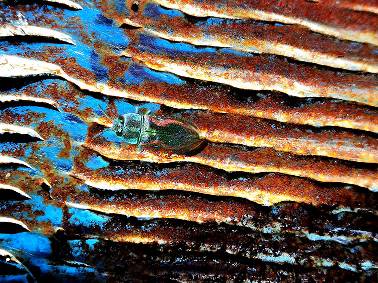 Wikipedia: Der Kirschprachtkäfer oder Bunte Kirschbaumprachtkäfer (Anthaxia candens) ist ein Käfer aus der Familie der Prachtkäfer (Buprestidae). Mit sieben bis elf Millimeter Länge gehört er zu den größeren Arten der Gattung Anthaxia. Mit seinen smaragdgrünen, kupferroten und schwarzblauen Farben ist er der bunteste Prachtkäfer Mitteleuropas.