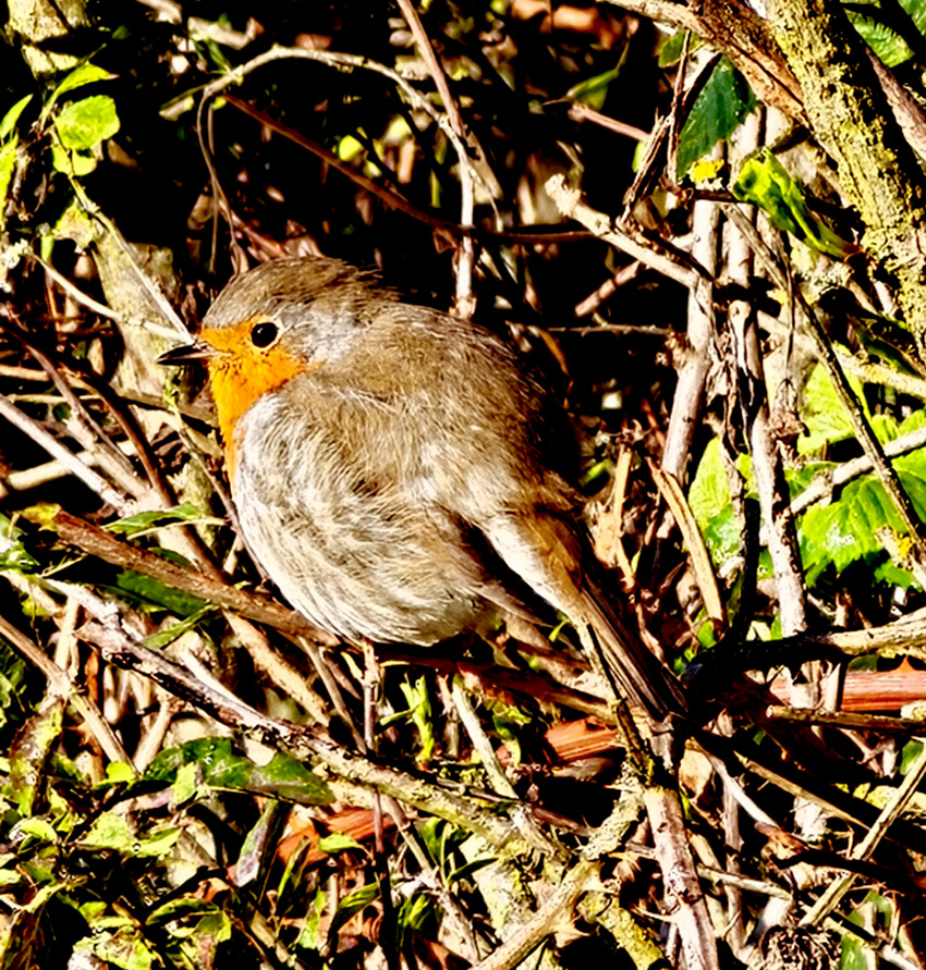 Rosi, das Rotkehlchen, treffen wir immer am selben Busch. Sie wohnt da: so richtig mit Hausnummer und allem Drum und Dran.