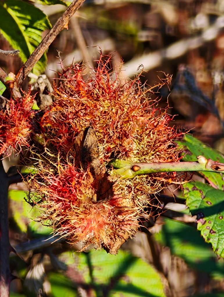 Die Hundsrosen schmücken sich statt mit Blattgrün nun mit Hagebutten und Rosengallen.