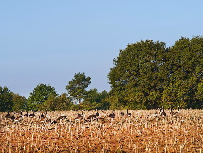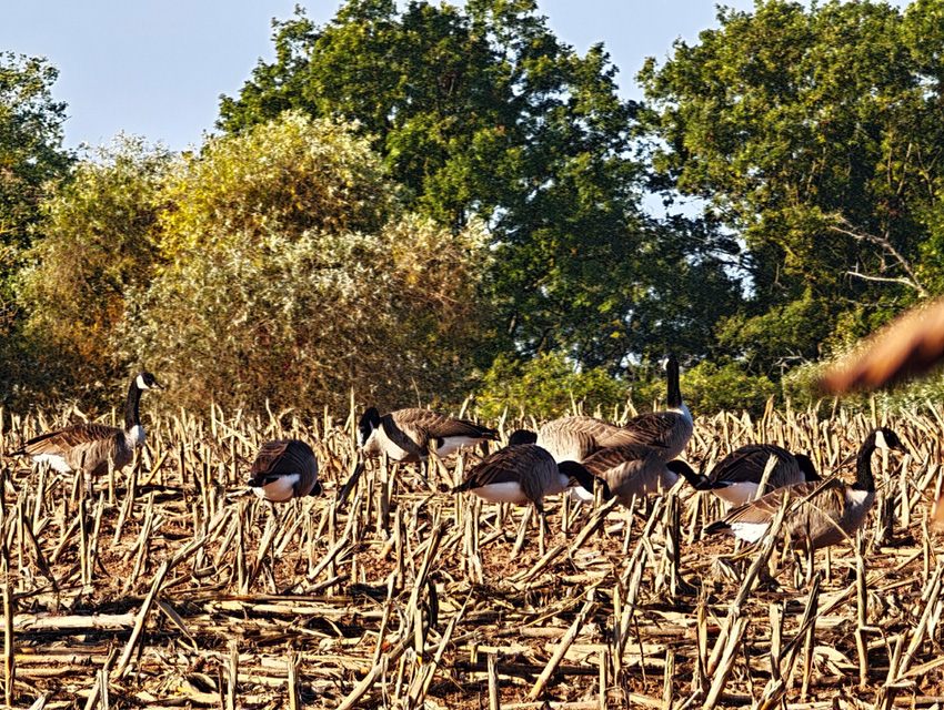 Auf dem abgeernteten Maisfeld macht seit zwei Tagen ein großer Gänseschwarm Halt und lässt es sich gut gehen.