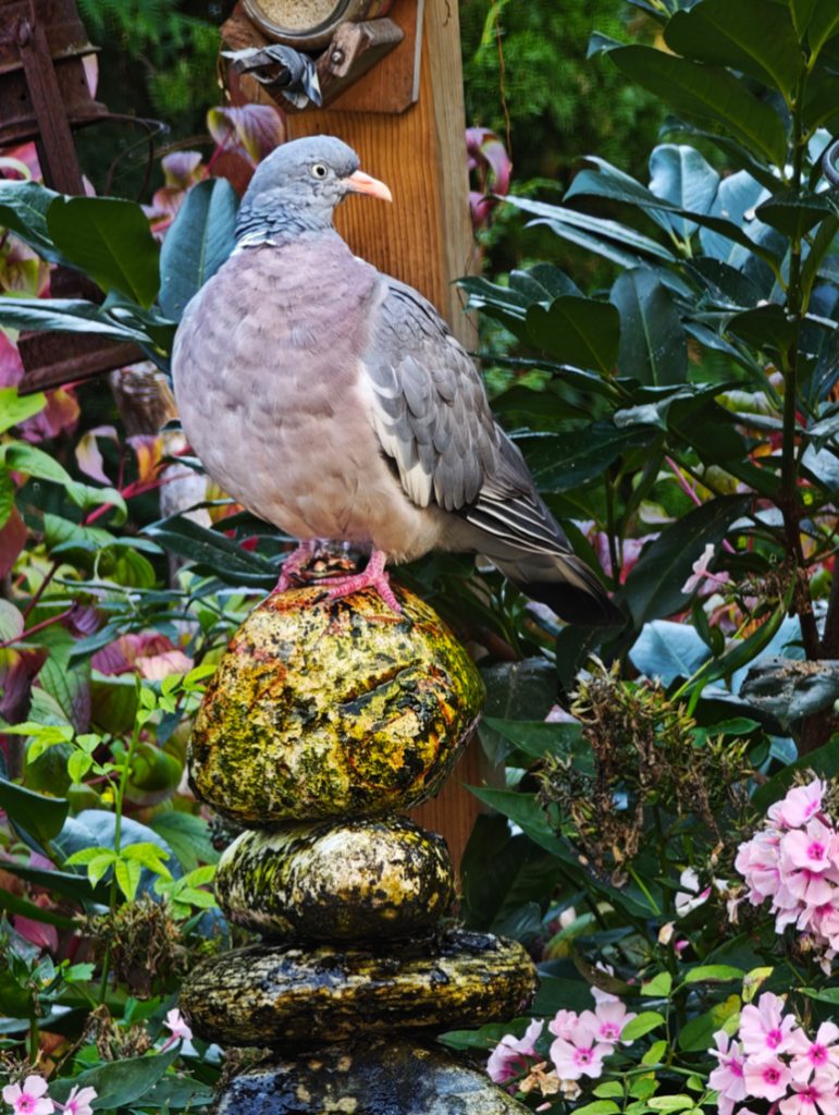 Ein Morgenspaziergang. 8,9 Grad. Schon beim Schuheanziehen auf der Terrasse beurteilt „Fatty“, unsere Ringeltaube kritisch mein Outfit, während sie ihr morgendliches Fußbad auf dem Sprudler unseres Steinebrunnens genießt.