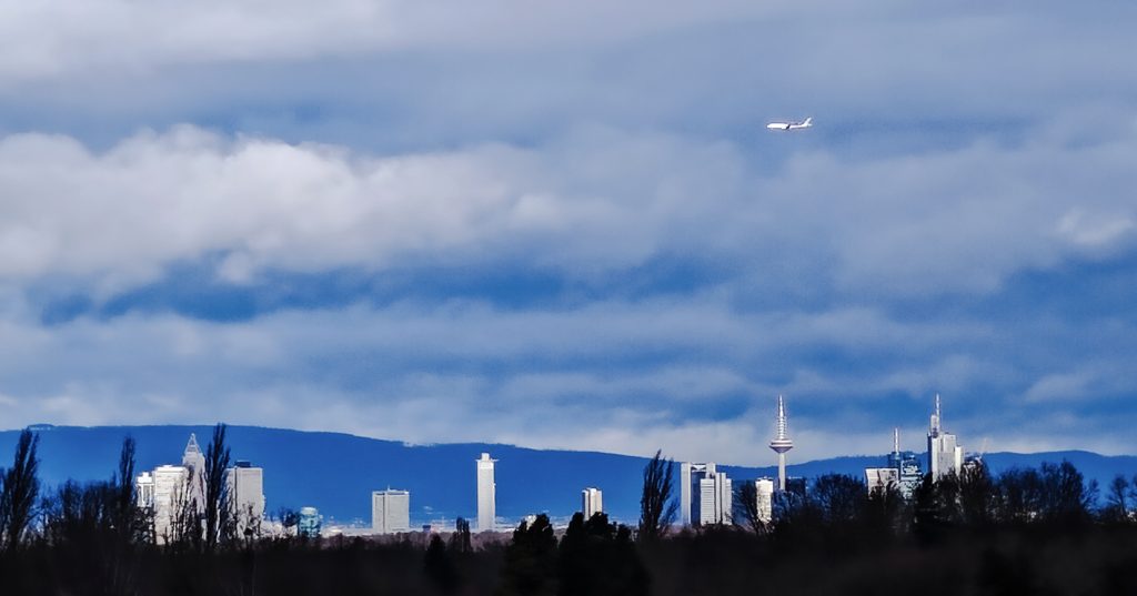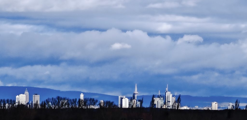 Ist es aber nicht. Gestern früh kam bei einem sturmgrauen Hundespaziergang für 5 Minuten die Sonne durch und tauchte die Skyline von Frankfurt in dieses blendend weiße Licht. 5 Minuten später war die Skyline in dem ganzen Grau kaum noch auszumachen. Die Farben sind nicht nachgearbeitet.