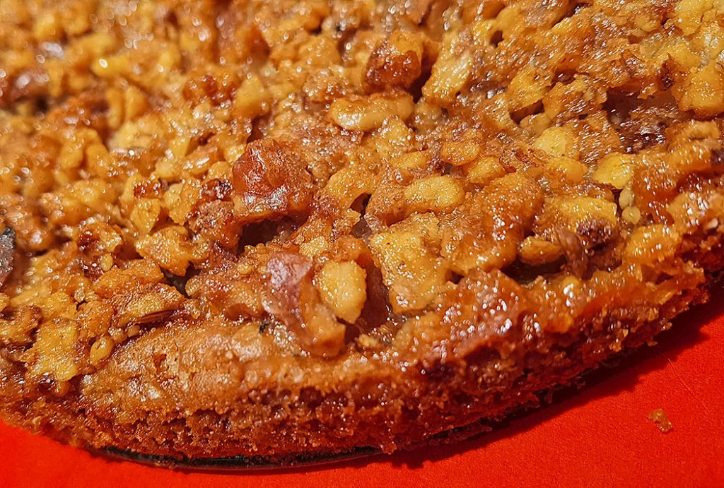 Knuspertarte mit Apfel und Walnusskaramell dazu Vanilleeis oder Vanillesauce.