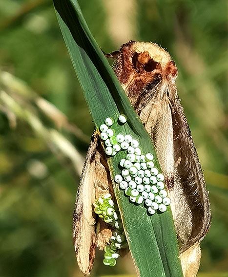 Vielleicht ein Birkenspinner? Aber dann die Eier auf Gras!?