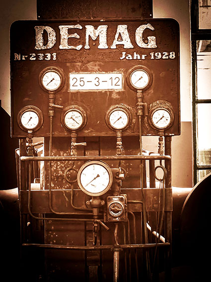 Also was geschieht? Steinkohle wird in Dutzenden hoher, schlanker Öfen bei bis zu 1400 Grad „gegart“. Dabei entstehen Koks und eine Menge unterschiedlicher Gase. Koks wird bei der Eisen-/Stahlgewinnung in den Hochöfen verfeuert. Koks brennt heißer, effizienter, rauchfreier als Kohle. Die anfallenden Gase gehen an verschiedene Industriezweige, müssen aber ebenfalls vorher aufbereitet werden. So z.B. in der Kompressorenhalle. Hier wird in den Kompressoren unter Hochdruck (9 atü) aus dem verdichteten Koksofengas Benzol- und Schwefelwasserstoff gewonnen. Das gereinigte Gas kann als Stadtgas ins Ferngasnetz eingespeist werden.